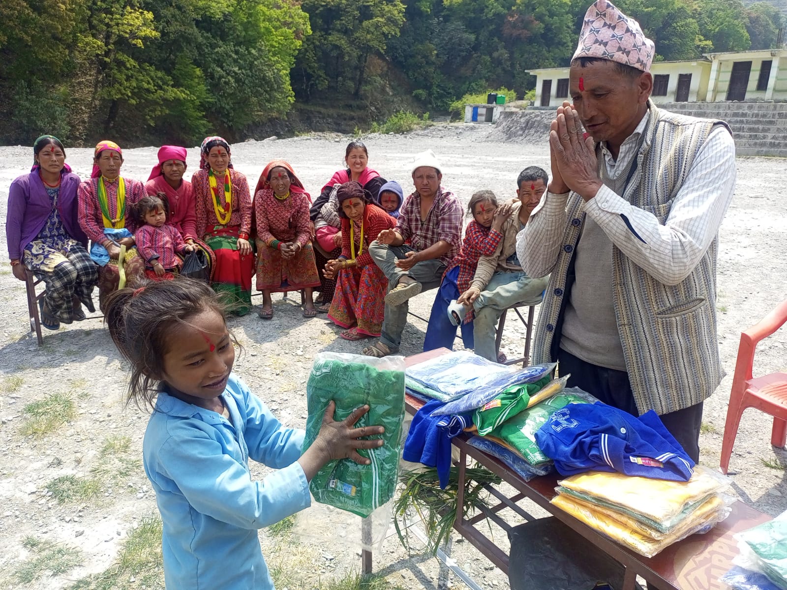 धनगढीको स्टेपिङ स्टोन इङ्लिस स्कूलले गर्यो बाजुराको बाल विकास आधारभूत विद्यालयका विद्यार्थीलाई कपडा वितरण